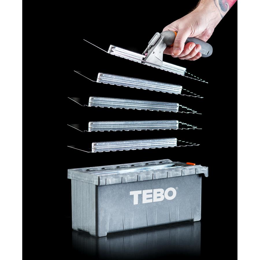 De löstagbara bladen gör att rengöringen efter användning blir enklare i jämförelse med fixkammar med fast handtag. Handtaget kan placeras längs med hela skenan på bladet och även vändas för att passa både höger- och vänsterhänta. Förvaringslådan har plats för ytterliga två stycken blad och kan kompletteras efter behov. Förvaringslådan har plats för ytterliga två stycken blad och kan kompletteras efter behov.