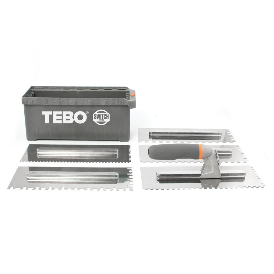 Smidigt set med ett stabilt softgriphandtag och fem stycken lösa fixkamsblad med tandning 4x4 mm, 6x6 mm, 8x8 mm, 10x10 mm och Hummer.